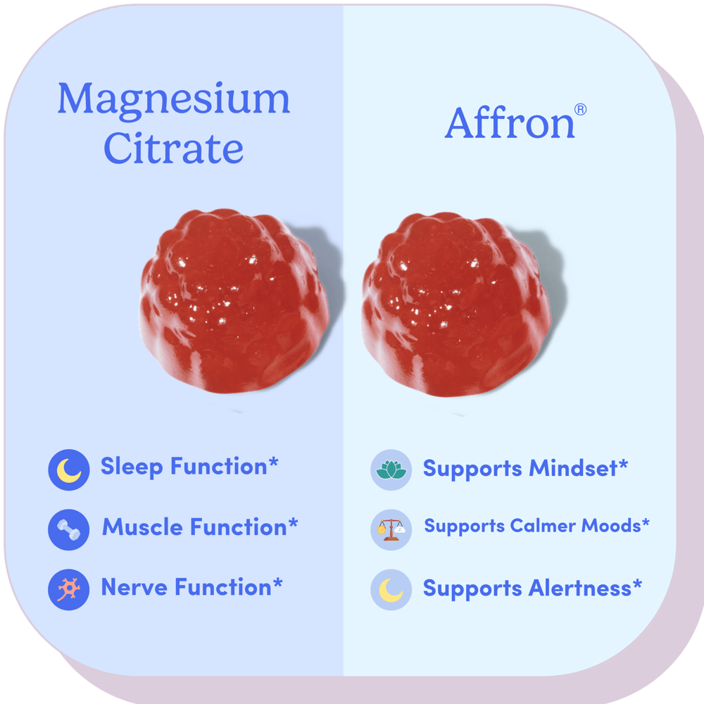 Most people aren’t aware of this! Yet, tons of parents give melatonin to their teens to help them sleep. But we say no to melatonin hormones for our Nighttime Reset gummies. Instead, we use Magnesium Citrate and Affron® to support your teenager’s sleep habits.